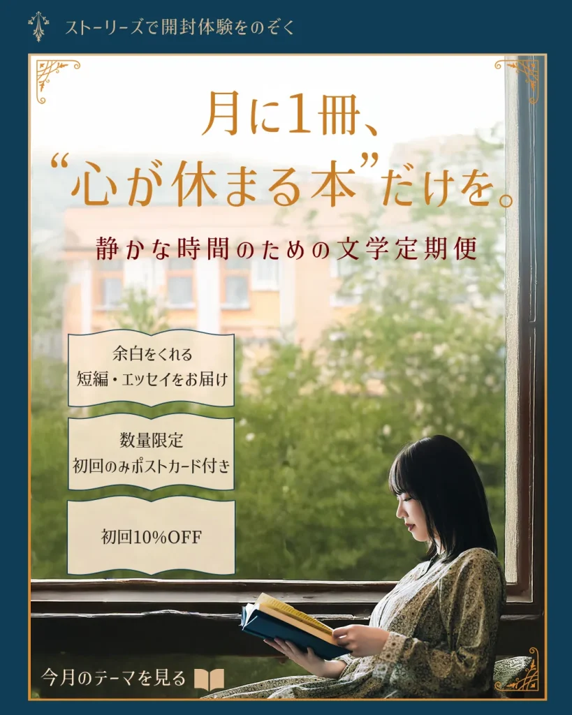 月に1度セレクトされた本が届く定期便サービスの認知拡大と申込数向上を目的としています。書籍や作家の知名度に依存せず、「静かで心が休まる読書時間」という体験価値が伝わることを重視。